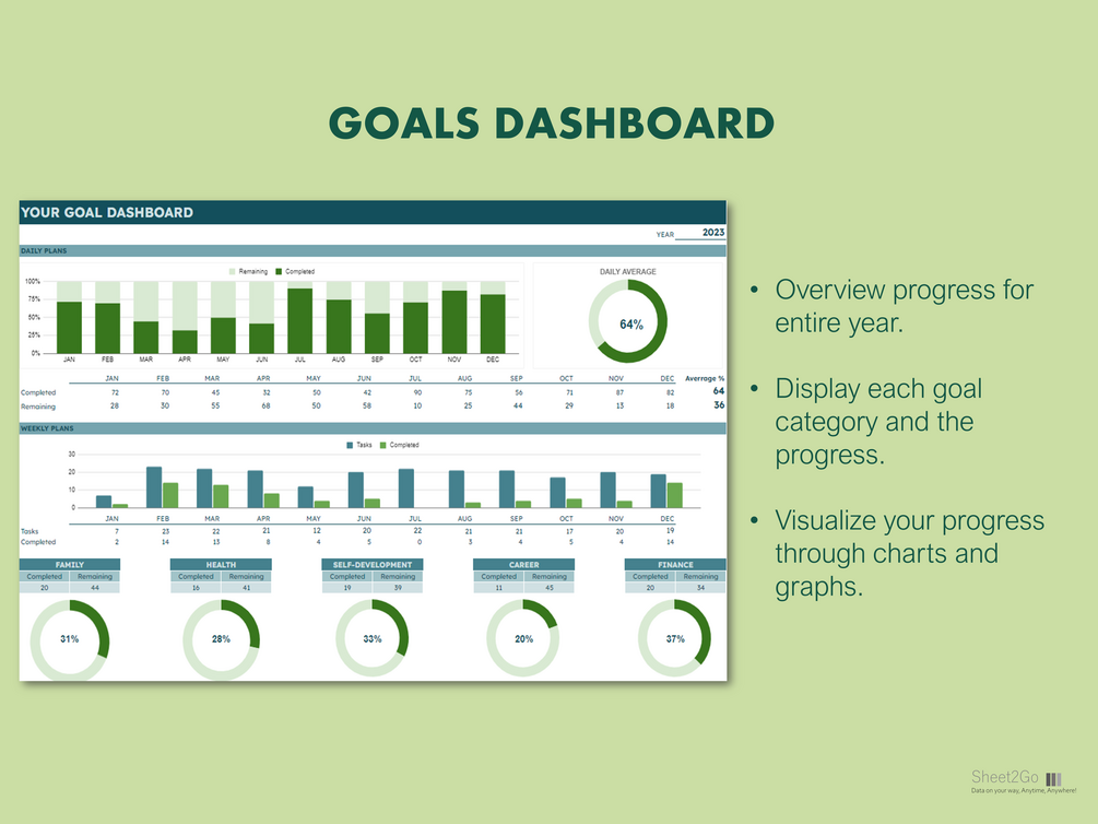 β Monthly goals setting and tracking sheets.